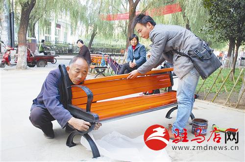 連日來,開發區建設交通局對轄區內所有游園進行了升級改造,對游園內現有水、電、路和各項基礎設施進行了全部維修和更新,確保游園干凈整潔。圖為該局工作人員正在市區文明大道北段一游園內安裝新木凳。 記者 馬國省 攝