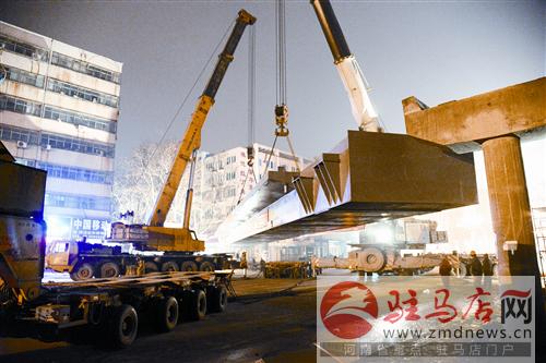 摘要: 3月2日零時許,市樂山大道與健康路交叉口過街天橋主梁吊裝成功。晚報記者 閆宏偉/攝