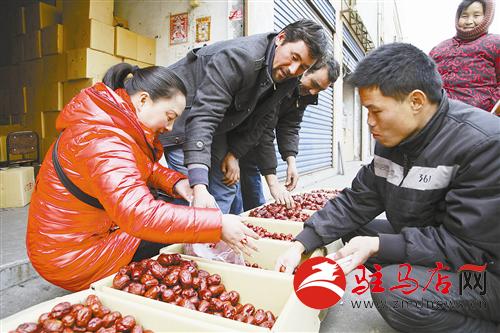 在市區眾信副食批發市場,來自新疆哈克蘇的青年艾力經營的大棗生意非常紅火。艾力的紅棗是在自己家鄉栽種培育,肉多味甜,很受顧客歡迎。艾力說,他在馬年春節前受朋友的指引,來到駐馬店經營紅棗,這里經營環境很好,人也很誠信,他是來對了。圖為顧客正在艾力的攤位前購買紅棗。