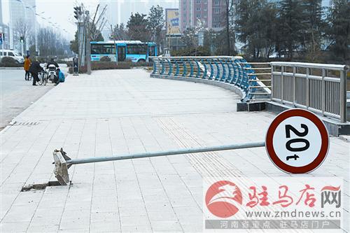 3月18日11時32分,新浪博主“瘋子的小8”@天中晚報,以《是哪路英雄引禁令標志折腰》為題,反映市文明大道與緯二路交叉口路標被毀(圖一),并戲問:“親,是誰推倒了你?又該誰去扶起你?”