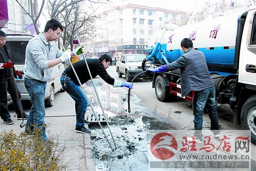 在附近商戶的抱怨和詢問(wèn)中,驛城區(qū)市政工程管理服務(wù)中心的工作人員開(kāi)始工作了。一名工作人員操作清淤車,用高壓水槍抽臟水。同時(shí),另兩名工作人員合作,用鐵棍和鐵鍬找出淤點(diǎn)并清理淤泥。20分鐘后,臭水溝被清理干凈了,工作人員張志強(qiáng)才抽空向附近商戶說(shuō)明了他們遲遲沒(méi)有過(guò)來(lái)清理臭水溝的原因。