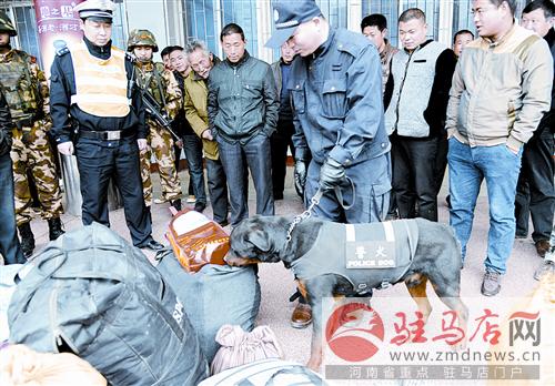 3月18日,駐馬店特警帶警犬在駐馬店火車站執勤巡邏,搜尋危險品和爆炸物品,確保鐵路運輸和乘客人身安全。