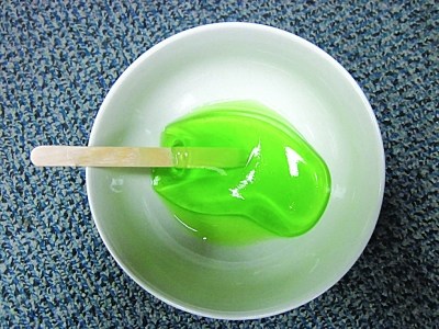記者做了個實驗:將一支拆開了包裝的“綠舌頭”放在碗中,讓其慢慢融化。和一般雪糕融化成液體不一樣的是,一個小時之后,原本堅硬的“綠舌頭”變成了一塊軟軟的、粘滑的膠狀物,有點像果凍卻不易被攪碎,碗底還有少量的淡綠色的液體,記者湊近了,能聞到濃郁的香精香氣。不過,從配料表來看,這款“綠舌頭”的食品添加劑并不算多,僅有檸檬酸、增稠劑、食用香精、檸檬酸鈉、焦糖色、檸檬黃、亮藍7種,遠低于市場上其他“花哨” 的雪糕添加劑含量。 實習生 丁夢青 水玉涵 本報記者 楊彥