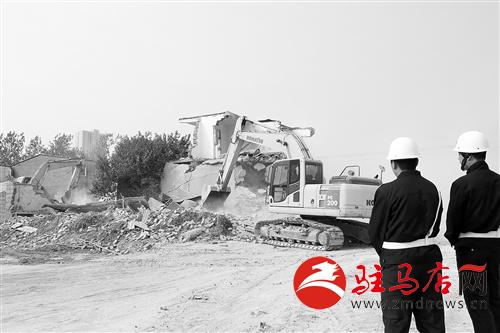 10月21日,位于市區洪河大道東段延伸工程的最后一棟房屋被全部拆除。圖為開發區金山辦事處執法人員正在現場監督拆遷工作。 記者 唐