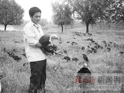 從2009年起,確山縣三里河鄉秀山村東關組農民王平先后投資數萬元,在家中辦起了火雞養殖場。如今,他養殖的火雞已發展到300多只。每天在三里河畔放養,這里水草豐美,火雞長勢喜人,也為王平帶來了可觀的經濟效益。