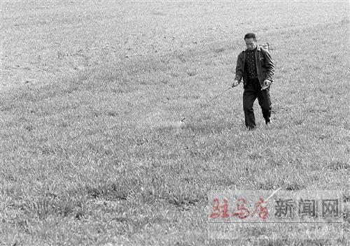 為防治小麥病蟲害,我市農民抓住天氣晴好這一有利時機,加強對麥田的管理工作。圖為汝南縣老君廟鎮農民在給小麥噴灑農藥、除草。 記者 吳 波 攝