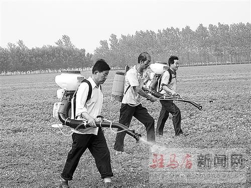近日,西平縣動員廣大干部群眾掀起以補苗、施肥、化學除草為主的秋田管理高潮。同時,該縣組織、培訓70多支農民專業技術服務隊深入地頭,根據農作物長勢情況現場為農民開“藥方”,切實做到管早、管精、管細,確保秋作物豐產豐收。圖為農民專業技術服務隊的農民在重渠鄉優質花生生產示范基地施藥時的情景。 記者 丁 振 通訊員 張建偉 攝影報道
