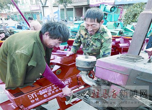 摘要: 又到三秋大忙、小麥備播時,各種玉米脫粒機(jī)、小麥播種機(jī)等小型農(nóng)機(jī)正熱銷。9月27日,在西平縣農(nóng)機(jī)市場里,農(nóng)民李樹堂正在挑選稱心的農(nóng)機(jī)。 記者 弓華靜 攝