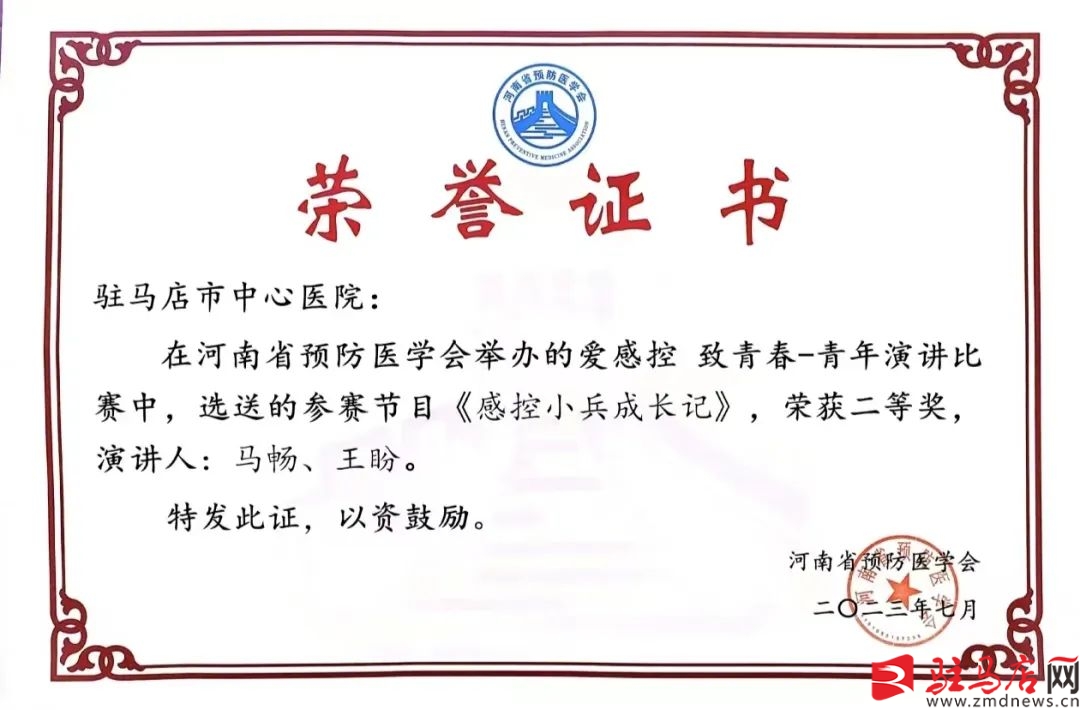 駐馬店市中心醫院麻醉科手術部馬暢、王盼代表駐馬店市代表隊參賽,演講的《感控小兵成長記》榮獲河南省第四屆“愛感控·致青春”青年演講比賽二等獎的好成績。