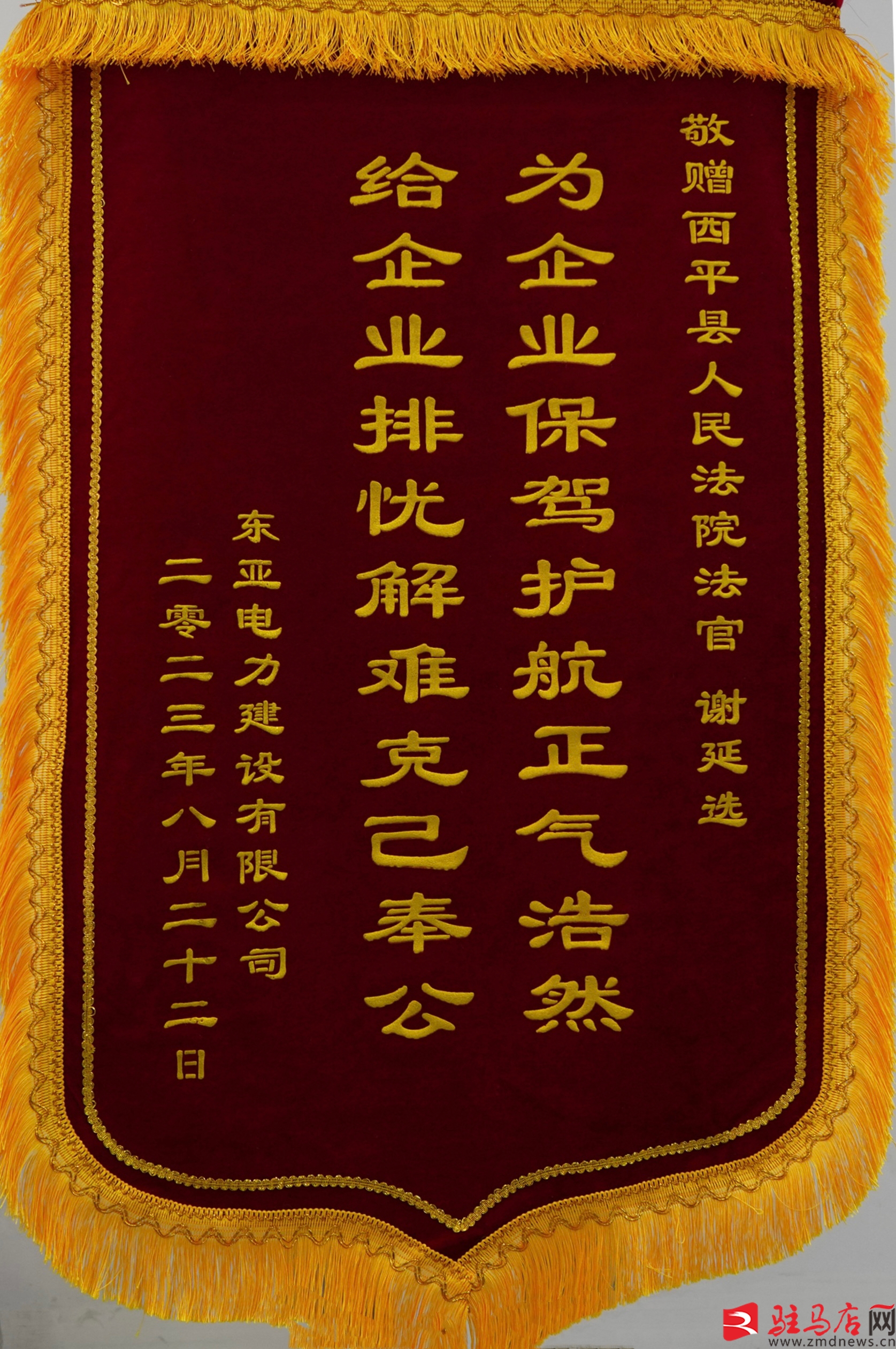 近日,西平縣人民法院盆堯法庭收到了一面從遼寧郵寄過來的錦旗,錦旗上寫著“為企業保駕護航正氣浩然,給企業排憂解難克己奉公”。“謝法官,很抱歉不能親自,只能用這樣的方式表達我們的謝意。”一句話,勾起了謝廷選的回憶。
