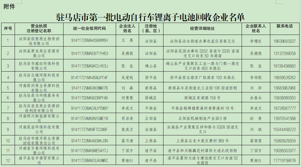 附件:駐馬店市第一批電動自行車鋰離子電池回收企業名單