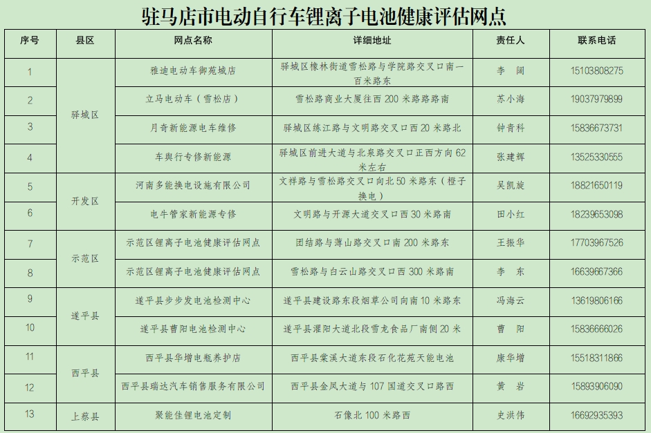 為降低電動自行車電池使用過程中的各類火災風險,切實保障人民群眾生命財產安全,提升電動自行車安全隱患全鏈條整治成效,目前駐馬店市新調整網點1個,新增網點3個,共建成28個鋰電池健康評估服務網點,各縣區群眾可根據需要就近到當地鋰電池健康評估網點,免費提供鋰離子電池檢測服務。